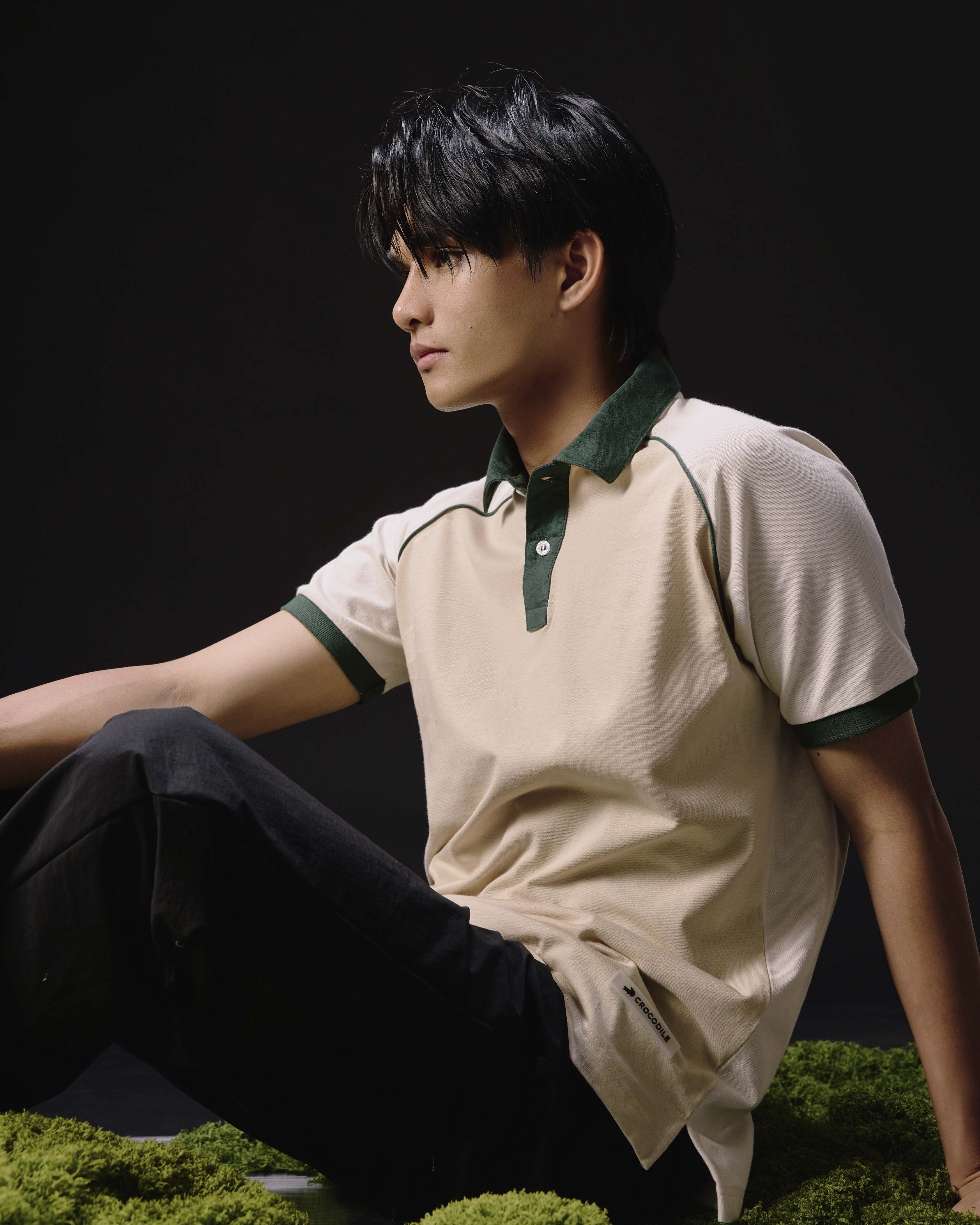 BEIGE COLOUR BLOCK CUSTOM FIT POLO SHIRT WITH MAGICAL FOREST COLLAR