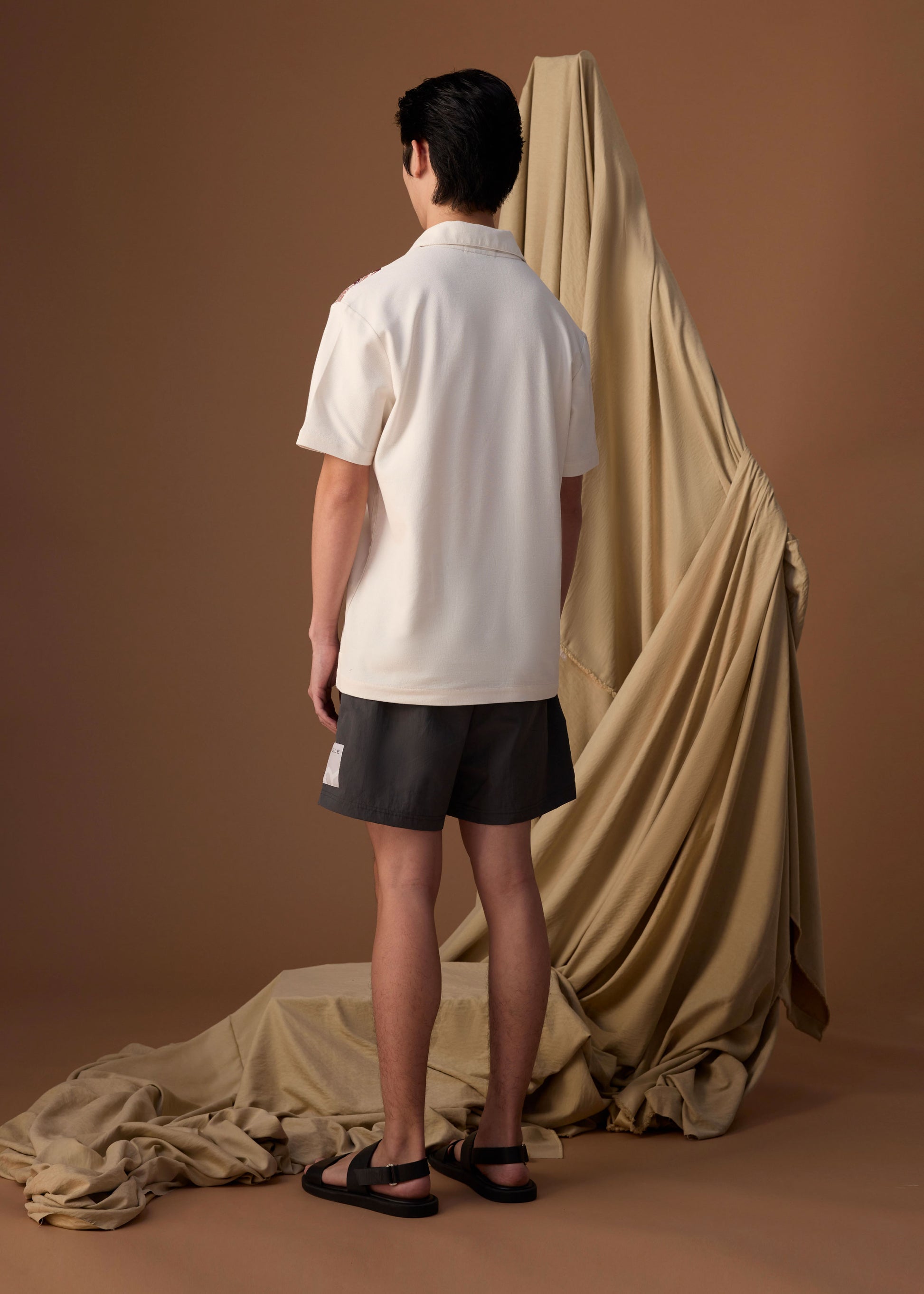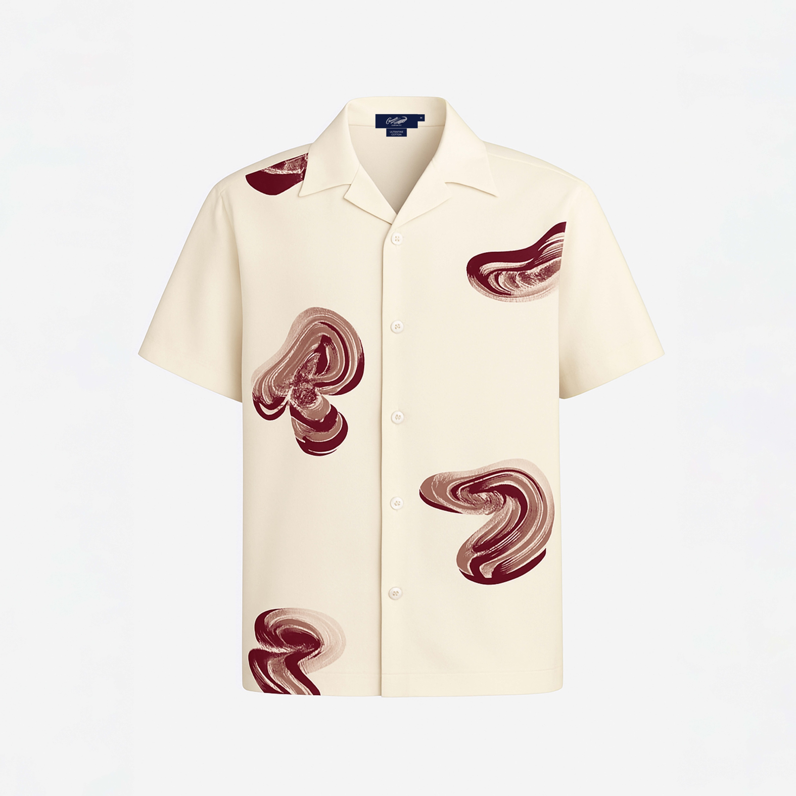 BEIGE CUSTOM FIT CUBAN COLLAR SHIRT WITH FABRIC PRINT