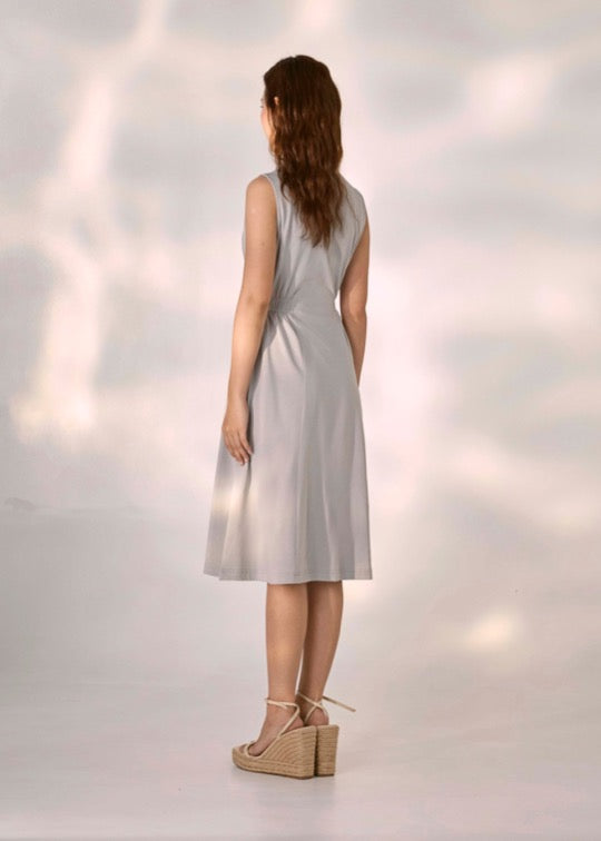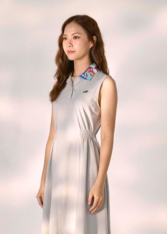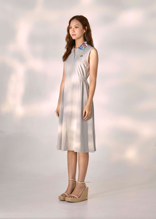 GREY MIDI DRESS WITH FABRIC PRINT COLLAR