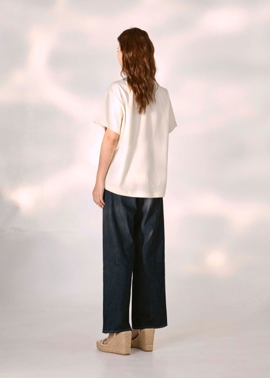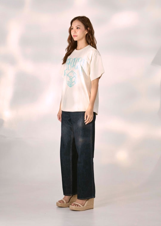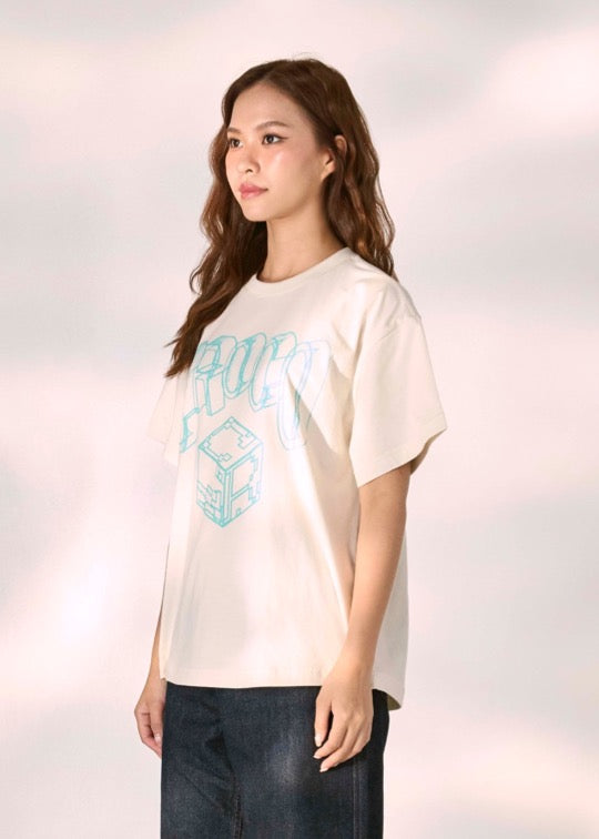 เสื้อยืดคอกลมแขนสั้นสีครีมทรงโอเวอร์ไซส์ฟิตพร้อมลายกราฟฟิก