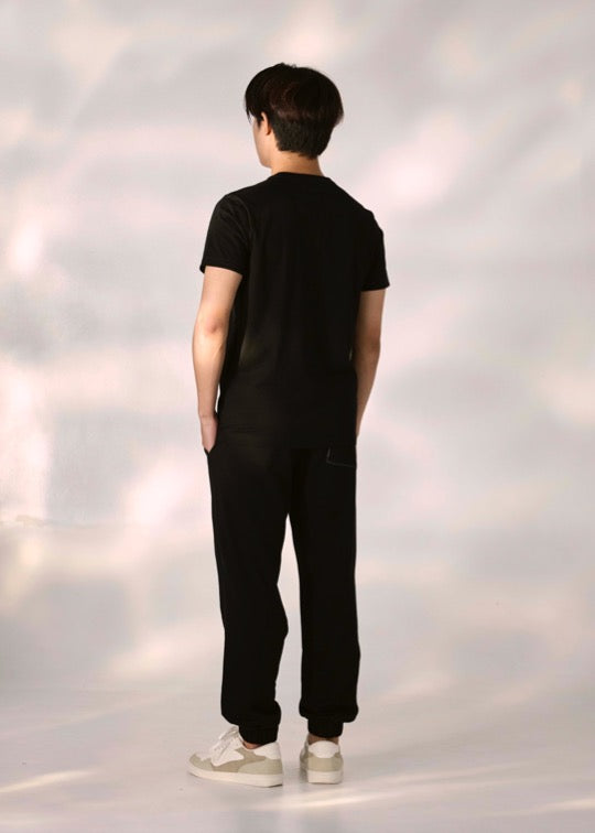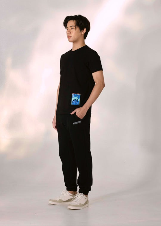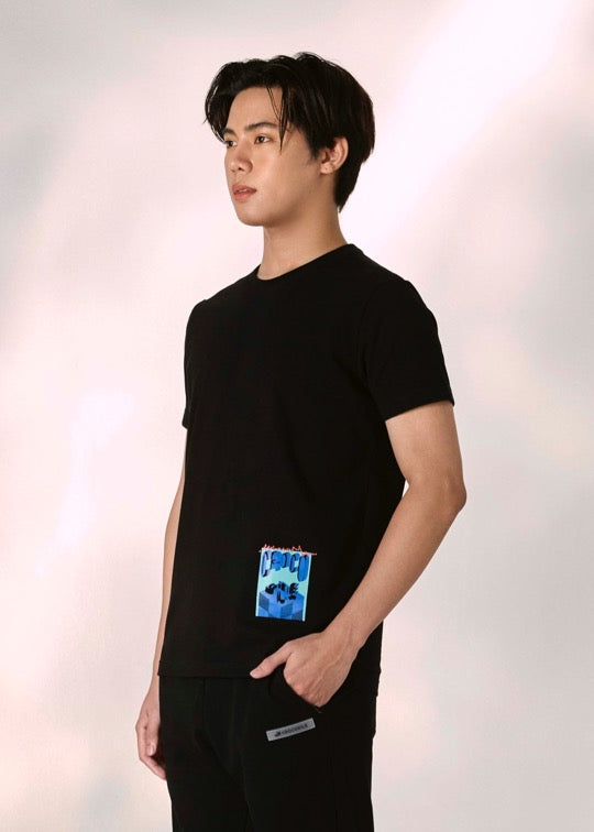 เสื้อยืดคอกลมสีดำทรงคัสตอมฟิตพร้อมลายกราฟฟิก