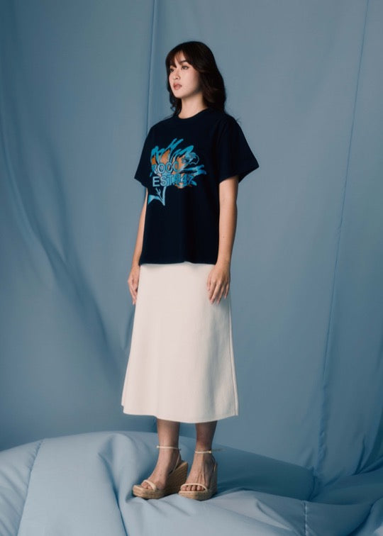 เสื้อยืดคอกลมแขนสั้นสีกรมทรงโอเวอร์ไซส์ฟิตพร้อมลายกราฟฟิก