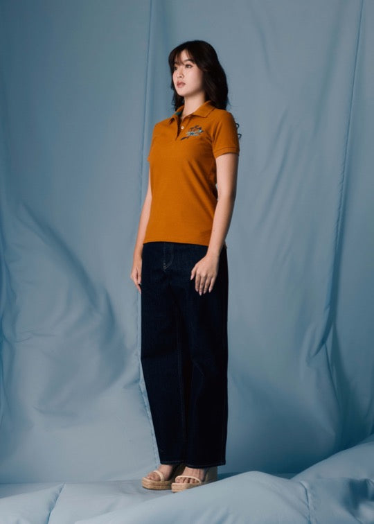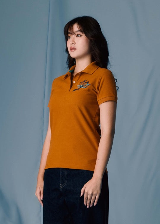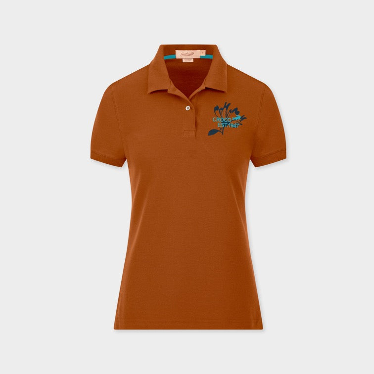 เสื้อโปโลแขนสั้นสีน้ำตาลพัมกิ้นสไปซ์ทรงเข้ารูปพร้อมลายกราฟฟิกและลายปัก