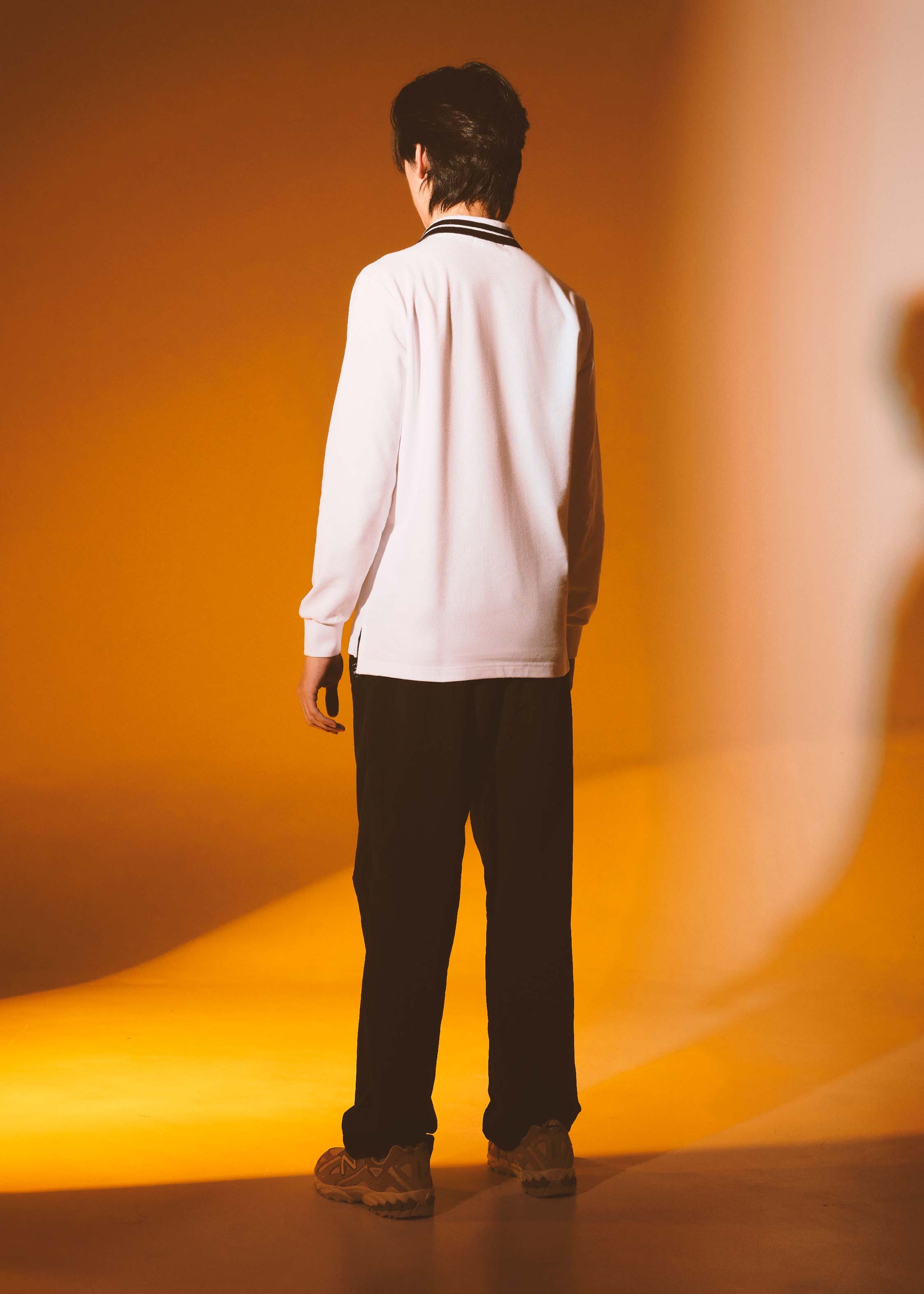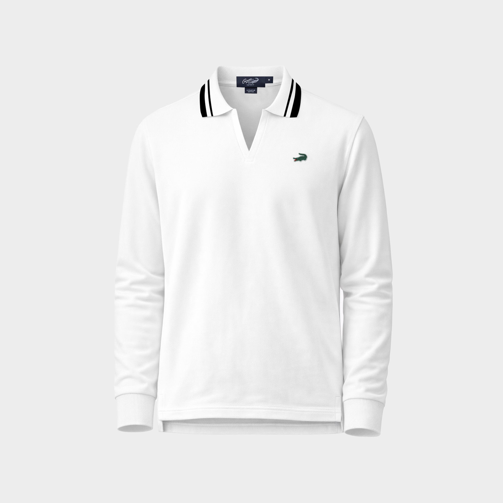 เสื้อโปโลแขนยาวทรงคัสตอมฟิตสีขาวพร้อมปกลายริ้วและโลโก้ยาง
