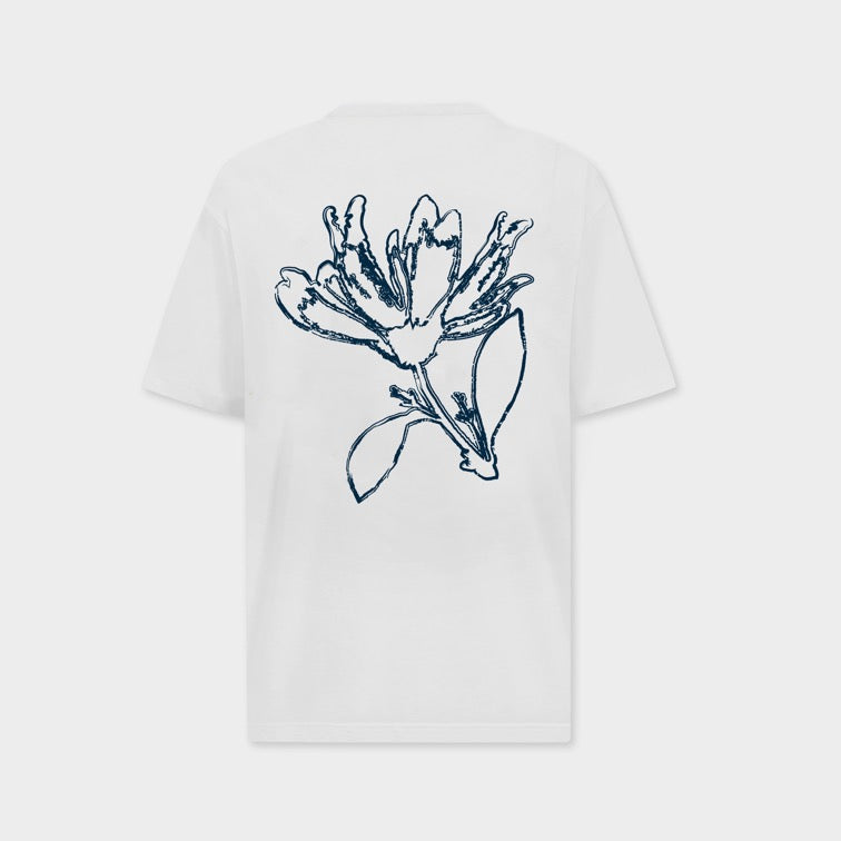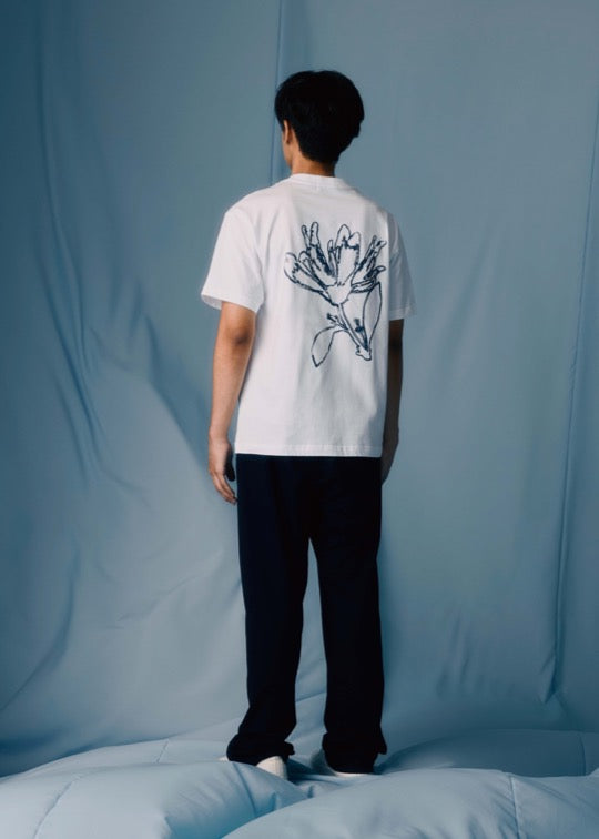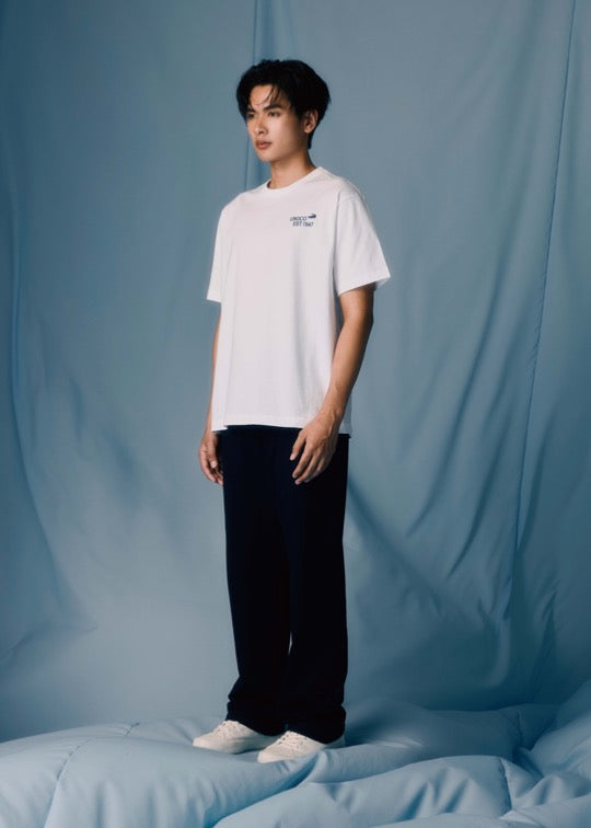 เสื้อยืดคอกลมแขนสั้นสีขาวทรงโอเวอร์ไซส์ฟิตพร้อมลายกราฟฟิก