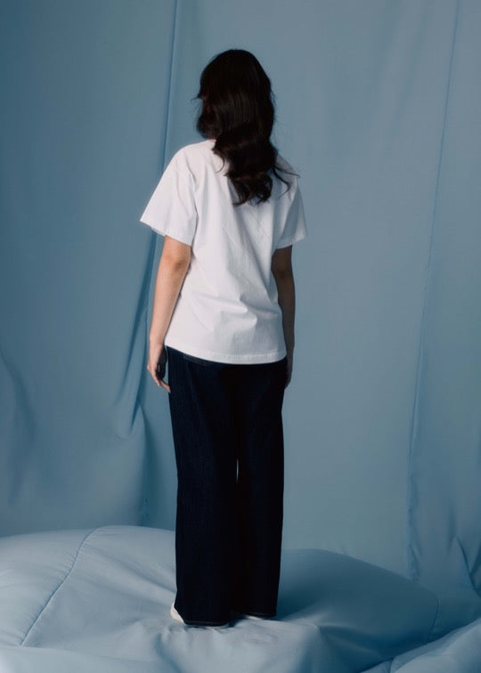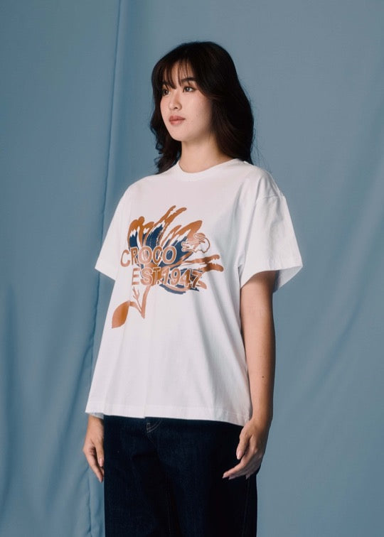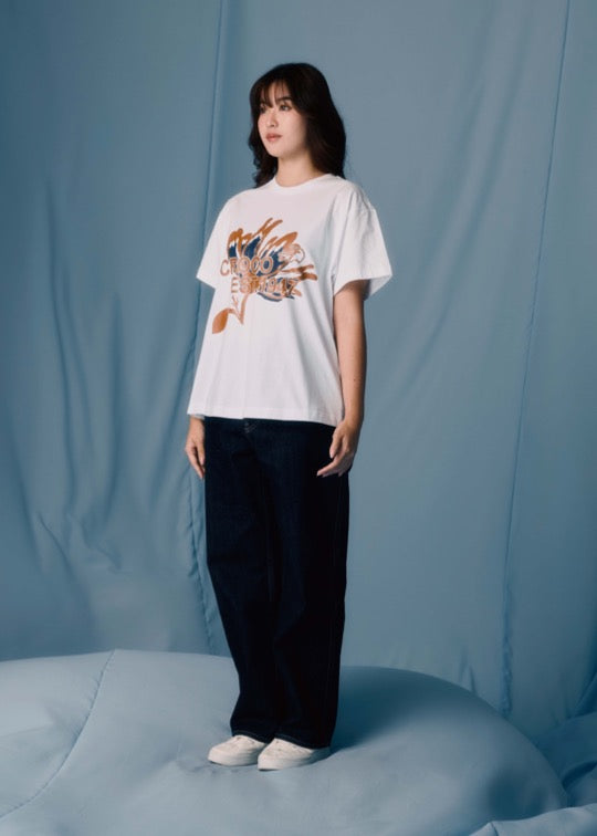 เสื้อยืดคอกลมแขนสั้นสีขาวทรงโอเวอร์ไซส์ฟิตพร้อมลายกราฟฟิก