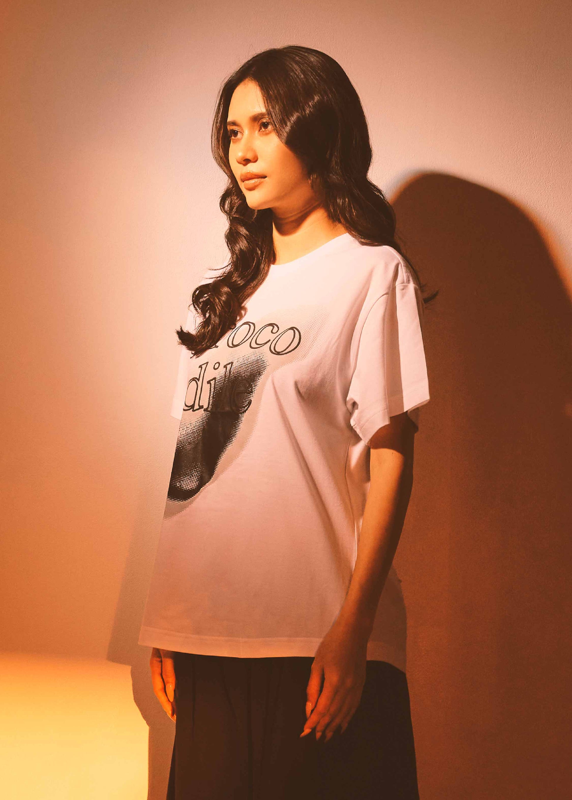 เสื้อยืดคอกลมแขนสั้นสีขาวทรงโอเวอร์ไซส์ฟิตพร้อมลายกราฟฟิก